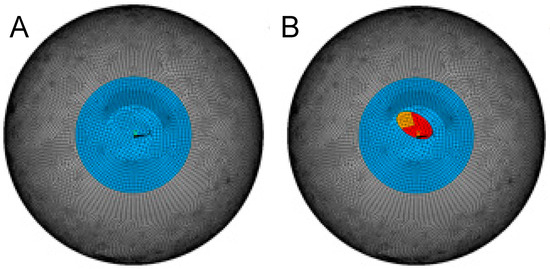 Meshed geometry of the healthy (A) and keratoconic (B) corneal model.