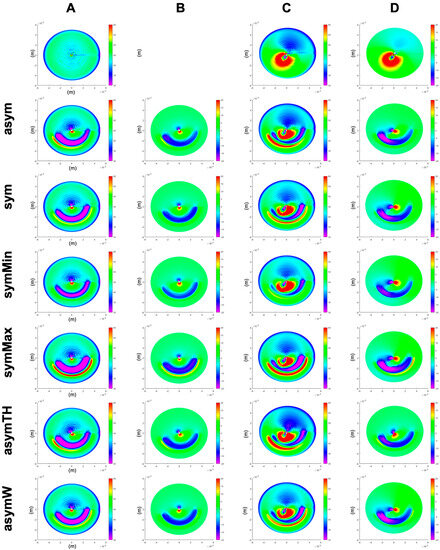 Sagittal curvature (A,C) and differential maps after simulated ICRS implantation (B,D) in a generic healthy (A,B) and a generic keratoconus (C,D) cornea. First row: the pre-op healthy (A) and keratoconus (C) cornea, as well as their difference (D). asym = progressive asymmetric ICRS, sym = average symmetric ICRS, symMin and symMax = symmetric ICRS with the minimal and maximal cross-section of the progressive asymmetric ICRS, asymTH = asymmetric ICRS with thickness-only variation, and asymW = asymmetric ICRS with width-only variation.