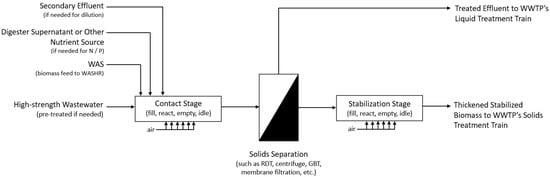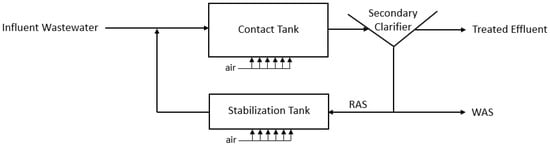 The WASHR process is based on the contact stabilization (CS) activated sludge process that was a popular treatment scheme for municipal WWTPs in the mid-20th century but was phased-out in most jurisdictions as effluent quality requirements became more stringent []. In its full-scale configuration, CS consisted of a contact tank where influent wastewater was allowed to mix with activated sludge. The residence time in the contact tank was short, generally ranging between 0.5 h and 3 h, providing enough time for contaminant sorption with the biological floc [,]. The solids separation of the activated sludge from the secondary effluent was accomplished in a clarifier, with treated effluent directed to additional treatment steps. To maintain consistent mixed liquor concentrations, WAS was periodically wasted from the system as needed. The return activated sludge (RAS) was pumped into an aerated stabilization tank, which provided the oxygenation and reaction time necessary for the oxidation of the organic material sorbed to the activated sludge floc. The removal efficiencies for 5-day biochemical oxygen demand (BOD5) were generally in the range of 85% to 95% for domestic wastewater; however, due to the high-rate nature of the CS system, this process provided little to no nitrification [,]. Figure 1 presents a process diagram of the conventional high-rate contact stabilization process.