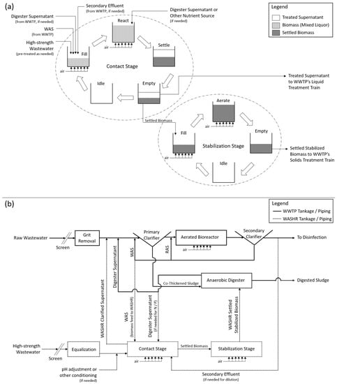 A novel pre-treatment method, the Waste Activated Sludge-High Rate (WASHR) process, was developed to meet these objectives, and an international patent application was filed for this novel technique []. The process utilizes two waste streams from the municipal WWTP process and a batchwise treatment in stand-alone tankage to reduce organic loadings into downstream WWTPs’ treatment trains. The performance of the WASHR process was confirmed at the bench scale for the treatment of high-strength WWW, and an economic analysis was completed using a case study to confirm its cost effectiveness.