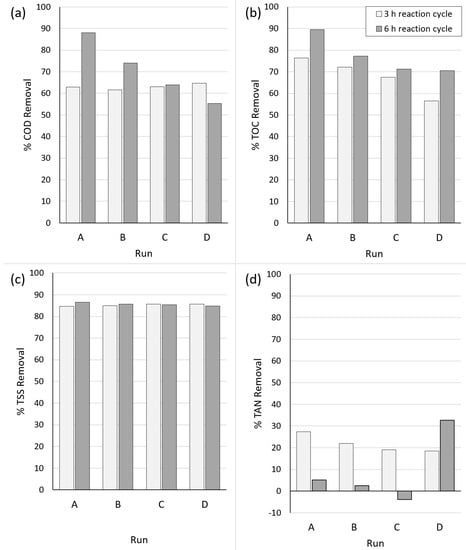 Figure 4 presents the removal efficiencies of COD, TOC, TSS, and TAN during the contact treatment phase of the bench-scale WASHR process for all treatment runs. The removal rates were based on the initial parameter concentrations shown in Table 2 and the measured clarified effluent concentrations after 3 h and 6 h of reaction time.