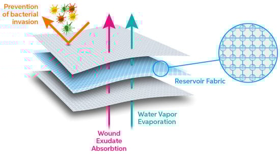 29] developed an absorbent wound dressing based on spacer fabric. In details, this three-dimensional system was assembled with two external hydrophobic surfaces and an absorbent middle layer. The spacer fabric had a remarkable Moisture Vapor Transmission Rate (MVTR) of 2069 (g/(24 h m