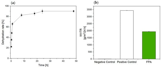 2) was immersed in PWE solution for 30 min. Then, the dressing was removed, weighed, and incubated in an oven at 37 °C for up to 48 h. At different time points (2–10–18–24–48 h), the dressing was weighed again (W1). The experiment was performed in triplicate, and the dehydration rate was calculated as reported in Equation (1) considering the weight of a non-imbibed dressing as background (W0). Data are represented in a mean ± standard deviation.