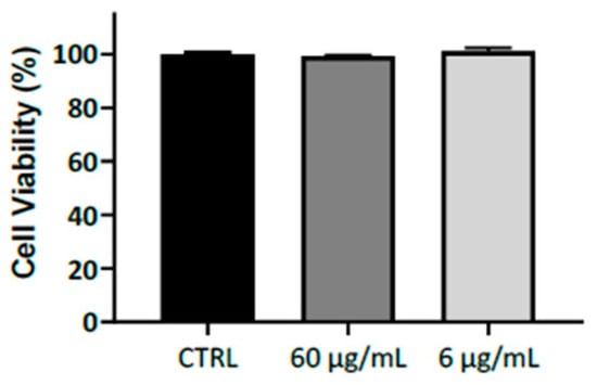 Human keratinocytes (HaCaT cells, American Type Culture Collection (Manassas, VA, USA) were cultured in Dulbecco’s Modified Eagle’s Medium (Lonza, Basel, Switzerland), supplemented with 10% fetal bovine serum, l-glutamine (2 mM), 100 unit/mL penicillin, 100 μg/mL streptomycin and maintained at 37 °C in a humidified atmosphere containing 5% CO2. The cell line has been authenticated by BMR Genomics (Padova, Italy). To evaluate the potential cytotoxicity of Rigenase, HaCaT cells were seeded in 96-well plates at a density of 5 × 103 cells/well in 200 µL of medium. After 24 h incubation, 6 and 60 µg/mL of Rigenase were added to the wells at and incubated for 48 h at 37 °C in 5% CO2. Cell viability was assessed by the colorimetric method based on [3-(4,5-dimethylthiazol-2-yl)-5-(3-carboxymethoxyphenyl)-2-(4-sulfophenyl)-2H-tetrazolium, inner salt; MTS] (Promega Corporation, Madison, WI, USA). The optical density of the chromogenic product was measured at 490 nm. Data were expressed as percentage of viable cells compared to untreated cells.