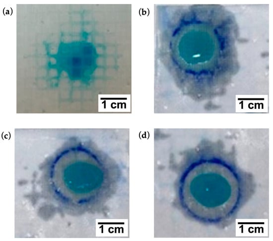 Figure 6 shows a visible reduction of lateral diffusion on the inner surface of the dressing at increasing viscosity AE values. No vertical diffusion was observed for 1% and 1.2% AE.