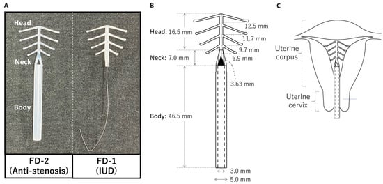 FD-2 is composed of inert elastic ethylene-vinyl acetate (EVA) copolymers, a soft material that can be safely used in biomedical applications, including contraception []. As shown in Figure 1, FD-2 consists of three parts: a body, neck, and head. The head, a fish-born-like structure, is identical to FD-1, an IUD that was developed more than 50 years ago using EVA copolymers and has been widely used in Japan []. Since the pliable arms on the side are designed to bend back and forth, as observed during FD-1 insertion, FD-2 insertion into the uterine cavity ought to be easy by holding the body of FD-2 and pushing its head into the uterine cavity through the cervical canal. FD-2 removal ought to be easy as well by gently pulling the body using forceps. The pliability of these arms can be achieved by the highly elastic nature of EVA copolymers. In a physiological condition without any forces on the FD-2, the arms do not bend and prevent FD-2 from falling out and help maintain the body part in the proper position within the cervical canal.