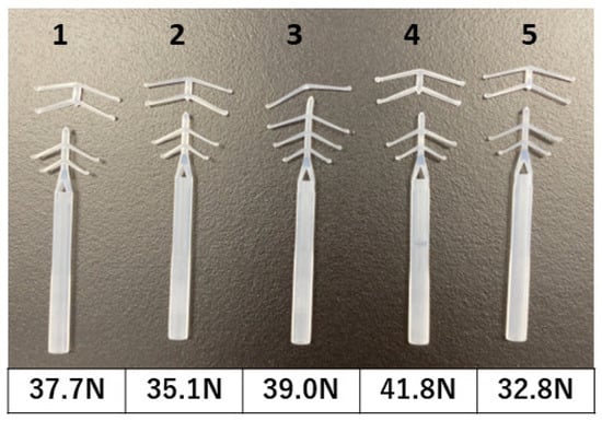 Uniaxial tensile tests were conducted using TechnoGraph TGI-1kN (MinebeaMitsumi Inc., Tokyo, Japan). The sample was conditioned in a thermostatic bath (36.5 °C) for 72 h before initiating the test. Subsequently, the tensile force was applied in the longitudinal axis to elongate FD-2, a preload of 1.0 newton (N) was applied, and the tests were run at a crossbar rate of 200 mm/min. Based on the guideline from the Pharmaceutical Affairs Bureau in Japan (notification no. 1228 promulgated in 1974), a breaking load greater than 9.8 N is considered passing.