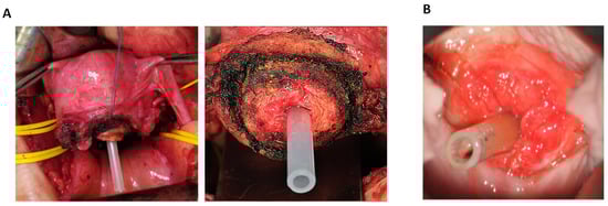 Pictures showing FD-2 used in patients with cervical cancer. (A) intraoperative views just after FD-2 insertion, before anastomosis of the uterine cervix (Left, distant view; Right, magnified view). (B) postoperative view (4 weeks after surgery).