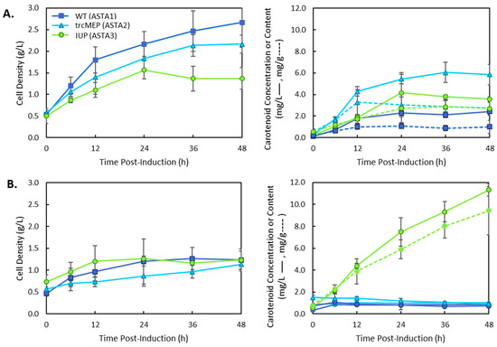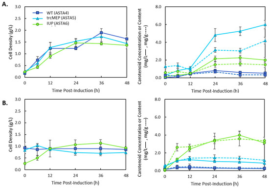Total carotenoid production in strains 4–6 containing the wild-type (4), trcMEP (5), or IUP (6) pathway and the p5T7-Astaipi plasmid. Cultures were grown in (A) LB media or (B) M9 media and induced with 0.1 mM IPTG. Cell growth by dry cell weight is plotted on the lefthand side. Total carotenoids were quantified, and carotenoid concentration (solid lines) and carotenoid content (dashed lines) are shown on the righthand plots.