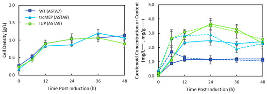 Total carotenoid production in ASTA strains containing the wild-type (7), trcMEP (8), or IUP (9) pathway and the p5T7-lycipi-ispA and pAC-ASTA plasmids. Cultures were grown in M9 media and induced with 0.1 mM IPTG. Cell growth by dry cell weight is plotted on the lefthand side. Total carotenoids were quantified, and carotenoid concentration (solid lines) and carotenoid content (dashed lines) are shown on the righthand plots.