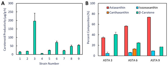Productivity and carotenoid composition of ASTA strains grown in M9 media. (A) Total productivity of each strain over a 48 h cultivation period. (B) Percent composition of carotenoids extracted from strains 3, 6, and 9 based on HPLC analysis.