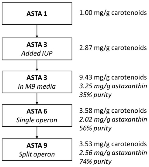 The accumulation of intermediate carotenoids in each strain also differed depending on the structure of the carotenoid operon(s). When cbfd1 was moved from the arabinose promoter to a stronger T7 promoter and when the operon was split into two operons controlled by two separate T7 promoters, astaxanthin production increased. In strain ASTA 9, there was no accumulation of canthaxanthin, suggesting that HBFD1 might be the rate-limiting step in this strain. Likely, CBFD1 was the rate-limiting step in strain ASTA 3 as there was a significant amount of β-carotene accumulating in this strain (Figure 6 and Figure A1). Fusions of CrtW/Z have been shown to be an effective strategy for increasing the conversion of zeaxanthin to astaxanthin by localizing the subsequent enzyme near the site of product formation [32,42]. Similarly, fusion to membrane proteins for targeted localization also improved astaxanthin production [39]. Chou et al. (2019) also found multiple promoters enhanced the biosynthesis of astaxanthin by increasing the efficiency of β-carotene conversion compared to using a single-operon system [31]. From Table 2, it can be seen that the species or origin, copy number, promoter, and combination of upstream and downstream genes used to play a significant role in the overall productivity of the system. The highest astaxanthin content found to date was achieved in strains with changes to membrane morphology and higher reactive oxygen species (ROS) levels [30]. However, these strains also exhibited decreased cell growth. Perhaps using CRISPR interference (CRISPRi) in a two-stage process might allow higher astaxanthin production after the majority of cell growth has occurred. A summary of this study and the changes and improvements made are shown in Figure 7.