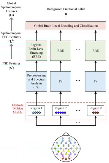 However, such existing approaches still have some limitations. First, the research results of EEG-based emotion recognition using deep learning methods still lag behind those of image and speech recognition. Therefore, to develop a more accurate and reliable emotion recognition model, an improved deep learning model that reflects EEG characteristics is required. Second, according to neurological studies, human emotions are closely related to various areas of the cerebral cortex, such as the amygdala, frontal lobe, and parietal lobe [,], and spatiotemporal information from different brain regions helps us understand human emotions [,,]. However, these neurological research results are not sufficiently reflected. Because the contribution of EEG signals related to each brain region is different, a method that can utilize the spatiotemporal information of different brain regions is required to understand human emotional states. Third, information about spatial resolution, brain region separation, brain network analysis, individual differences in emotions, and capturing dynamic changes in emotions, which multichannel EEG includes, is not fully utilized. To this end, new studies have recently attempted to utilize the advantages of multichannel EEG fully to identify activities in specific regions of the brain and perform more accurate and multifaceted emotion recognition through the interaction and information combination among brain regions. However, the number of studies is extremely small. Zhang et al. [] used a hierarchical spatiotemporal EEG feature learning model with attention-based antagonism neural network, whereas Wang et al. [] proposed a transformer-based model to hierarchically learn the discriminative spatial information from the electrode level to the brain-region level.
