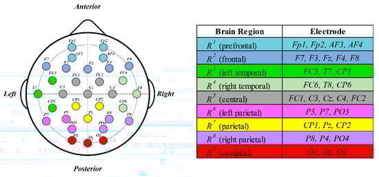 The human brain consists of several regions, each performing its own function. These include the frontal, temporal, central, parietal, and occipital regions. Each of these regions shows different brain activity depending on the emotion, which is crucial in understanding complex human emotions. Applying this phenomenon to analyze the correlation among brain regions that respond to human emotional changes, we divided these regions into nine regions based on structure and function []: prefrontal, frontal, left temporal, right temporal, central, left parietal, parietal, right parietal, and occipital. Based on the nine brain regions classified above, each electrode can be divided into the corresponding brain region groups based on the position of the electrode attached to the brain to measure the multichannel EEG signal. An example is shown in Figure 2. Electrodes, divided by region, are shown on the left side of Figure 2, and electrodes that belong to the same region are marked with the same color. This information is summarized in the table on the right-hand side. Each region of the brain is expressed as , and electrodes Fp1, Fp2, AF3, and AF4 are assigned to (prefrontal); F7, F3, Fz, F4, and F8 to (frontal); FC5, T7, and CP5 to (left temporal); FC6, T8, and CP6 to (right temporal); FC1, C3, Cz, C4, and FC2 to (central); P3, P7, and PO3 to (left parietal); CP1, Pz, and CP2 to (parietal); P8, P4, and PO4 to (right parietal); and O1, Oz, and O2 are assigned to (occipital).