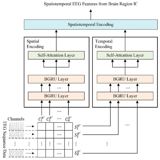 - To obtain activity weights for each brain region according to emotional state, a regional brain-level encoding module was designed based on a dual-stream parallel double BGRU encoder with self-attention (2BGRUA) for extracting spatiotemporal EEG features. In particular, the spatial encoder learns the interchannel correlations and the temporal encoder captures the temporal dependencies of the time sequence of the EEG channels. Subsequently, the output of each encoder can be integrated to obtain the local spatiotemporal EEG features;