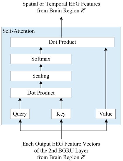 The 2BGRUA model builds two BGRU networks in series and adds a self-attention mechanism. In this hybrid model, the first BGRU layer extracts future and past time series EEG information, and the second BGRU layer is applied to learn more significant feature representation, while better emotional feature information is provided by assigning weights to contextual feature information using a self-attention mechanism. In general, self-attention can effectively model global interactions; however, it has limited disadvantages in figuring out local dependencies. In contrast, the BGRU can effectively identify regional dependencies that reflect bidirectional temporal patterns and flows within the input sequence. Therefore, we applied the BGRU before self-attention. Figure 5 shows the structure of the self-attention layer.