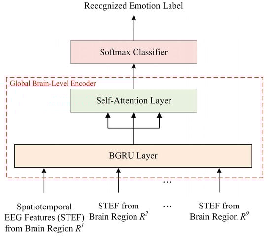 Figure 6 shows the structure of the global brain-level encoding and classification model, which consists of BGRU, self-attention, and softmax. Unlike the regional brain-level encoder, which uses a two-layer BGRU, the global brain-level encoder uses a single-layer BGRU. This is because it is only used to combine information among brain regions based on spatiotemporal information sufficiently extracted from the regional brain-level.
