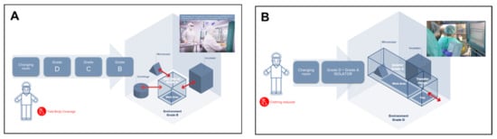 This is one of the reasons why, most recently, in 2017, a specific Part of EudraLex Vol. 4 was published where the production of ATMPs in “closed systems” was outlined. Closed systems, such as, for example, isolators, bioreactors, and other devices classifiable as “closed systems” are “physical barriers” which, as indicated in the EudraLex Vol. 4 Part IV guidelines, can be used to produce ATMPs (Figure 1B). Thanks to this strict physical separation between operators and the product, the use of closed systems can be performed within a Grade D background area, as stated in Part IV (§9.5.1): “[ATMPs] Manufacturing should take place in clean areas of appropriate environmental cleanliness level. More specifically, as regards production in a closed system, in an isolator, or positive pressure isolators: a background clean area of Grade D is acceptable” [].
