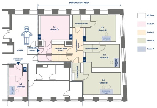 - Grade A: an area of high-risk operations that require asepsis (i.e., filling, opening, and closing of containers, such as vials or test tubes). These conditions are usually guaranteed by a homogeneous laminar air flow in the work environment, and they are monitored for the entire duration of critical processes [].