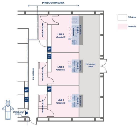 For the closed system equivalent layout (AinD), the data have been collected from those relevant to the CPC (Centre de Production Cellulaire) based in Epalinges and belonging to the Lausanne University Hospital (CHUV), as described by Chemili and collaborators [].