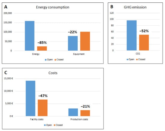 However, comparing the total value of energy consumption calculated as the sum of the energy required for ventilation, distribution and air treatment, and instrumentation, we have demonstrated that the energy required to complete a 21-day production cycle in an open system is considerably higher than that required by an equivalent production cycle in a closed system. The same applies to GHG emissions, which are higher for the open systems compared to those generated by the use of closed systems.