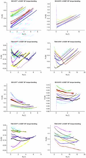 | Archwire Category | Torque Bending | Fx (N) (SD) | Fy (N) (SD) | Fz (N) (SD) | Mx (Nmm) (SD) | My (Nmm) (SD) | Mz (Nmm) (SD) | |