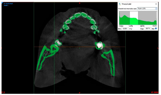A cone beam computed tomography (CBCT) scan (0.4 mm) of the upper and lower jaw was obtained. The scanned data were imported into Mimics software (V21; Materialise; Leuven, Belgium) in DICOM format. Three main planes—axial, sagittal, and coronal—were used to display CBCT scans. To segment a certain tooth, the dental tissue selection needs to be defined using the Threshold function, which corresponds to various shades of gray in HU (Figure 1). To simplify the segmentation, the area of interest (lower right wisdom tooth) can be de-limited. Different HU ranges are also defined for the teeth under the Threshold function (tooth (CBCT); min = 1200 HU, max = 3071 HU).