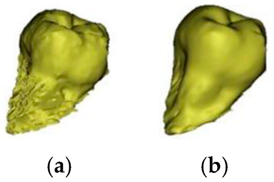 3D model of the tooth (a) before the smoothing of the contours and (b) after the smoothing of the contours.