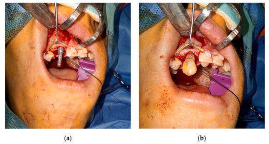 If a replica tooth was used beforehand, it was prepared in accordance with the principles of asepsis (according to instructions for use—E-guard: disinfection with 70% ethanol solution before use). The autotransplantation can be performed with local or general anesthesia depending on the position of the tooth and the difficulty of the surgery, as well as the compliance of the patient. Before the procedure, the oral cavity and surrounding tissues are disinfected as part of the preparation for the autoimplantation site. The extraction of the tooth or raising a flap in edentulous area should consist of minimal trauma, The recipient socket was prepared with abundant saline irrigation, a surgical contra-angled handpiece with an implant surgical kit, using an ascending drill width to achieve a proper socket size. A paralleling pin (a) and sanitized replica were used to check the socket angulation and depth of the implant bed (b) (Figure 5). An occlusal contact of the replica and the antagonist tooth was checked using the articulation paper—no contact should be registered. After reaching the proper position, the replica was left in the new socket for prevention of bone bleeding and to minimize the contact of the bone with the external environment. The replica was left in the socket until the final placing of the donor tooth.