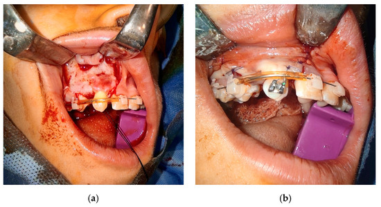 The donor tooth was extracted utilizing a minimally traumatic technique Figure 6a, which included raising the surgical flap in case of its impaction or releasing of PDL with scalpel before extraction with forceps. Bone removal from the area of the root surface had to be avoided due to the risk of damaging the PDL. After confirmation of a satisfactory position, the donor tooth was finally removed from its socket. A leukocyte- and platelet-rich fibrin (L-PRF) concentrate previously prepared by a standard protocol was placed into the neo-alveolus, and the donor tooth was gently placed into its position. A stopwatch was used to measure the time between the extraction of the donor tooth and its insertion into the new socket. Special care was taken to insert the donor tooth in a single attempt, as previously simulated by the replica. The donor tooth was quickly inserted in the new area and fastened with a suture. In cases where the patient undergoes an orthodontic treatment Figure 6b with a fixed appliance, the replanted tooth can be fixed with brackets. The donor tooth was checked by the articulation paper once more.
