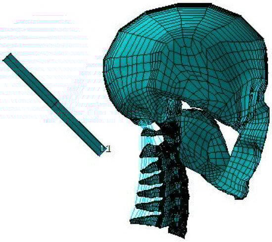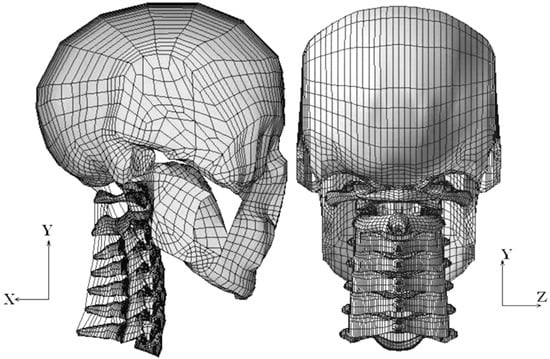 In this study, a previously developed 3D FE model of the bony skull (C0) and cervical vertebrae (C1–C7), together with all associated articulated soft tissues, was used []. For the sake of completeness, here is a concise, in-depth explanation of the model development. Based on the embalmed C0 and C1–C7 vertebrae of a 68-year-old cadaver specimen, the coordinates of the surface profile of the bony structures (C0, C1–C7) were continuously captured with a flexible digitizer (FaroArm, Bronze Series, Faro Technologies, Inc., Lake Mary, FL, USA), and these data were later post-processed for the creation of an FE meshed model using ANSYS (ANSYS, Inc., Canonsburg, PA, USA). And the fundamental geometry for the intervertebral disc (IVD) modeling were derived from the average values given in the literature []. Each spinal motion segment, including cortical bone, cancellous bone, posterior elements, a disc annulus, a disc nucleus, an endplate and all ligamentous tissues associated with the motion segments between C0 and C7, were incorporated with their attachment points based on an anatomic text to generate the full C0–C7 model.
