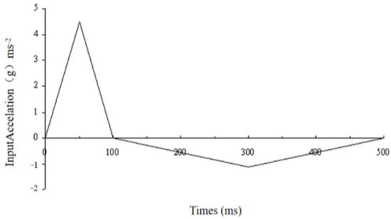 Using the same C0–C7 FE model, for the investigation of whiplash, the inferior surface of C7 was subjected to a 500 ms horizontal acceleration along the X-axis with a peak value of 4.5 G and a slower deceleration, as illustrated in Figure 3. During this process, the inferior surface of C7 was restrained from moving laterally or vertically. In addition, we introduced a square foam plate measuring 100 × 100 × 20 mm3 inclined at an angle 45° and 100 mm away from the head during the procedure. The foam plate’s rather large surface area ensured that the whole back of the head came into full contact with it. The headrest’s Young’s modulus was set at 2 MPa, which is comparable to that of soft foam material []. These circumstances were created to mimic the whiplash method used in previous studies [,]. After that, within the first 200 ms following impact, the expected responses of each motion segment were gathered and compared to the experimental data. Then, in an attempt to understand the role of input peak acceleration, distance between the head and headrest and headrest angle during a whiplash operation on the reaction of the head–neck complex, three extra analyses were carried out. For these additional analyses of peak acceleration/angle of headrest (i.e., 4.5 G/30°, 8.5 G/45° and 8.5 G/30°), appropriate changes were made in the FE model data file, and the computed results were investigated.