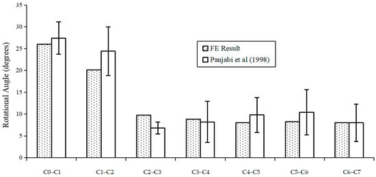 Detailed comparisons between the projected overall main sagittal ROM (flexion and extension) for each locomotion segment and the results achieved by Panjabi et al. are shown in Figure 4 []. The model’s predicted ROMs and the experimental results were within one standard deviation. Because of the geometrical shape of the articulating joints and the expected nonlinearity of the ligaments, during flexion and extension, the whole structure’s projected moment–rotation relationships were extremely nonlinear. The C0–C1 section underwent the largest sagittal rotational motion of roughly 26° under either loading, followed by 20° in the C1–C2 section. The lower cervical segments between C2 and C7 experienced lower sagittal rotations between 8 and 10°, indicating that compared to the lower cervical vertebral level, the higher cervical segments (C0–C2 level) are significantly more flexible. Under flexion and extension, respectively, the rotation angles’ predicted ratios in terms of the C0–C2 section to the whole cervical spine were 47.3% and 55.6%. Additionally, the lower cervical levels (C3 to C7) showed few differences in ROMs. These results closely align with those found in experimental research [,]. The cervical spine’s normal motion in the sagittal plane under pure 1.0 Nm flexion and extension loadings was accurately approximated by the present model.
