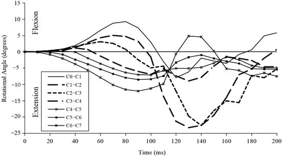 Over the 200 ms period, as shown in Figure 5, the C0–C1 and C1–C2 segments experienced flexion–extension–flexion motions, while the C6–C7 segments experienced extension–flexion–extension motions for different time spans.