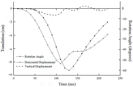 During the first 40 ms, C0 translated posteriorly by about 10 mm without any rotation or vertical motion, after which it continued to translate posteriorly and reached a maximum translation of 80 mm at about 110 ms, and the posterior translation of C0 decreased.