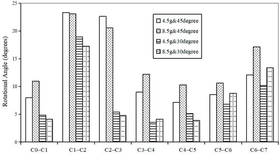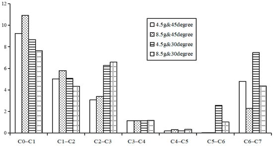 Under different G-acceleration inputs at C7 and headrest inclination conditions, the effect on the kinematics of the cervical spine was not explicit. For the peak flexion rotation of various segments, under different G accelerations with the same headrest inclination, there were fewer variations in peak flexion angles for most of the motion segments (C0–C5) compared to the many variations in the C5–C6 and C6–C7 segments (Figure 7). However, under different headrest inclinations, the variations in peak flexion rotations for different segments varied depending on the G acceleration. At 4.5 G with different headrest inclinations, the variations in peak flexion rotation were greater in the C2–C3, C5–C6 and C6–C7 segments. At 8.5 G with different headrest inclinations, greater variations in peak flexion rotations were observed in the C0–C1, C2–C3 and C6–C7 segments. No flexion rotation motion was observed in the C5–C6 segments under both 4.5 G and 8.5 G acceleration with the headrest inclined at 45°. This was not the case when the headrest was inclined at 30°, suggesting that the rear region of the translated and rotated C0 impacted the 30°-inclined headrest at a much earlier time, instead of at 130 ms, changing this segment’s extended motion to flexed motion.