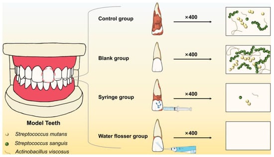 In this study, three bacterial strains closely related to caries (S. mutans, S. sanguis, and A. viscosus) were chosen to construct biofilm models. Syringe rinsing was used to simulate ordinary mouthwash. The role of water flosser in oral hygiene maintenance was clarified by comparing the difference in the effects of water flosser and mouthwash on sucrose removal and plaque control on the smooth surface of resin teeth. It is hypothesized that water flosser can achieve the better removal of sucrose and dental plaque biofilm than ordinary mouthwash due to its strong and pulsed water flow and thus provide a better guide for patients in oral hygiene maintenance (Figure 1).