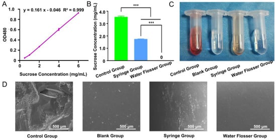 (A) Calibration curve for quantification of sucrose concentration. (B) Remaining sucrose concentration quantification in the control group, syringe group, and water flosser group. Data are presented as mean ± standard deviation (n = 6). Statistics significance: *** p < 0.001. (C) Photos of remaining sucrose solutions. (D) SEM examination of the morphology of the treated teeth.