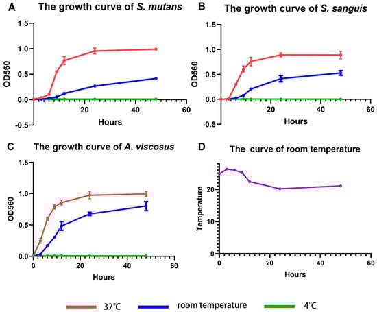 Growth curves of (A) S. mutans, (B) S. sanguis, and (C) A. viscosus at 4 °C, room temperature, and 37 °C. Data are presented as mean ± standard deviation (n = 3). (D) Room temperature curve.