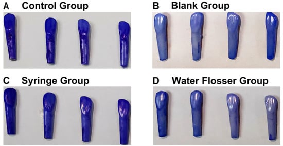 CV staining to assess total biofilm clearance showed that in the control group, large dark purple plaques almost completely covered the isolated resin teeth, especially the neck and roots of the isolated resin teeth (Figure 4A), while no CV staining was exhibited on teeth in the blank group that had not been immersed in bacterial suspensions of S. mutans, S. sanguis, and A. viscosus (Figure 4B). There was no significant difference between the control group and the syringe group, which still showed large continuous purple staining (Figure 4C). However, almost no CV staining was observed on teeth in the water flosser group, similar to the control group (Figure 4D). This indicated that the water flosser rinsing had a significant effect on biofilm removal and continuity disruption. The significant difference in biofilm removal effects between the two groups can be attributed to the weaker force and larger diameter of the water flow in the syringe group, which caused the water to spread out and have little effect on biofilm removal when it reached the tooth surface. In contrast, the effectiveness of the water flosser is achieved due to the utilization of the fluid shear of high-velocity and ultra-fine water flow.