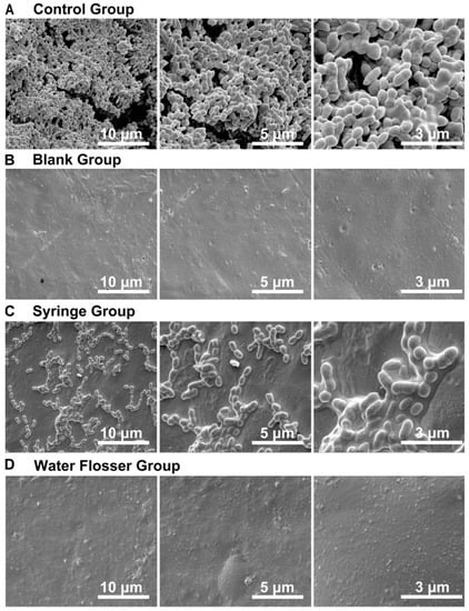 The biofilm removal efficacy from the model teeth was also examined via SEM. We found that biofilm was well formed in the control group, with a large amount of multilayered bacteria presented on the teeth surface (Figure 6A), while the surface of the blank teeth is quite plain (Figure 6B). Upon the use of syringe wash, the biofilm was substantially broken, and only some scattered bacteria were found on the surface of model teeth (Figure 6C). As expected, use of water flosser removed the biofilm from the teeth surface to the largest extent, and the teeth surface was found to be the same as that in the blank group (Figure 6D). These results are well consistent with those shown in Figure 4 and Figure 5 above and indicate that water flosser is able to efficiently remove the biofilm plaque on the model teeth.