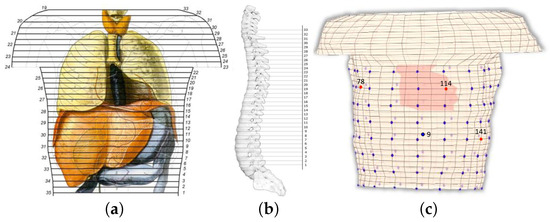 (a) Vertical view of the human torso, where the basic organs are presented alongside the horizontal sections of the anatomic atlas [45]. The numbering on the left corresponds to the original sections, whereas on the right is the employed numbering for the model. (b) Side view of the spine, where the reference axis and the model’s sections are also illustrated. (c) Discretized thorax model for FEM simulation, where the cardiac elements and electrodes position are also illustrated, the red dots are the electrodes (78, 114, and 141) in the front (thorax), and the blue dot is the electrode 9 in the back.