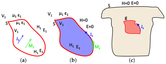 Let us assume, for instance, that and are electric and a magnetic sources, respectively, located within the volume and generating the fields and , as can be seen in Figure 2a. An equivalent problem to this could be the one presented in Figure 2b, where the internal sources have been removed and replaced with their equivalent surface sources and that generate the internal field, while the external field can be considered as null (Love’s Equivalence Principles). These equivalent surface sources are [39]