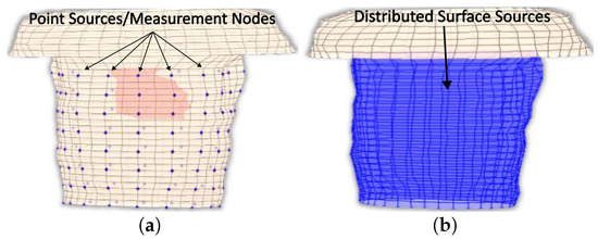 where the applied surface source, is the original one, is the originally generated electric field, and is the voltage. In our case, corresponds to the measured potential over the surface of the model, i.e., . However, to address Huygens’ Principle, distributed surface sources must be employed.