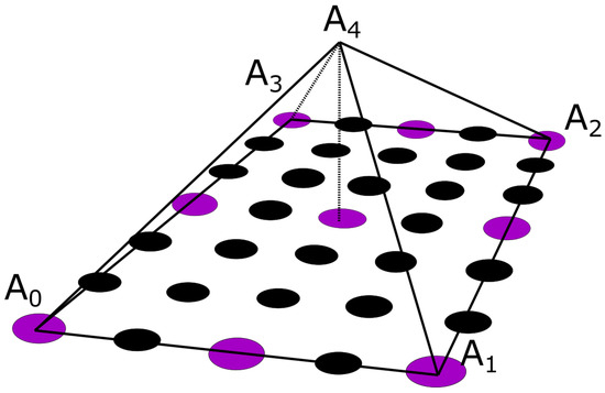 A pyramid element interpolation of the provided voltage data was implemented to calculate the surface potential of the thorax/head [49]. Let us consider the pyramid element shown in Figure 4. In Figure 4, the purple circles suggest nodes for which the value is considered known, i.e., the potential measurement from the corresponding electrode, whereas the black ones denote nodes for which no information is available. In the problem under study, the electrodes are evenly placed throughout the thorax, having an electrode placed at every third level with a spacing of one node between every two electrodes of the same level, as can be seen in Figure 1c and Figure 4. To enable the calculation of the potential distribution, all pyramids were centered around nodes for which the potential was known. Thus, for the evaluation of each node, all the contributions of its surrounding electrodes must be considered. Roughly speaking, considering the interpolation shape function for the pyramid , the potential for a specific node can be calculated as
