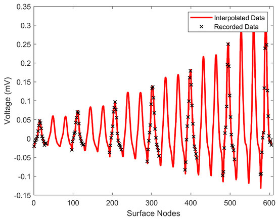Explicitly, since not all surface thorax nodes correspond to a specific electrode, there are nodes for which there is no available information on measurements. Thus, to address this problem, the provided recorded potentials must be interpolated to result in a “measured” surface potential distribution that covers all nodes as seen in Figure 3.