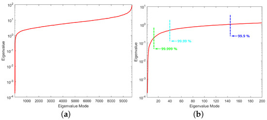 Note that the very small eigenvalues are usually highly inaccurate, and if we included them, they may cause instability or large errors in the expansion (10). Consequently, without affecting the accuracy of the calculated solution, it is possible to discard those very small eigenvalues to achieve better stability and a faster solution. The difficulty related to this approach is that, herein and in electromagnetics in general, the useful information lies in the small, low-order eigenvalues as depicted in Figure 7. Hence, the challenge is to discard only some very small eigenvalues that represent eigenvectors with dominant numerical “noise” inaccuracies. Since eigenvalues constitute the spectral representation of the structure, Parseval’s theorem applies. That is, the square of the weighing factors represents the power carried by that eigenmode. Considering the eigenvalues contributing to of the total energy, 9589 eigenvalues out of 9729 are retained, as seen in Figure 6b. These 140 eigenvalues present low eigenvalues and weighing coefficients, so we can assume that they represent numerical noise, and they will degrade the efficiency of our algorithm if they are not removed. Even though this might seem like a small reduction in the matrix rank, considering the volume conductor models of higher discretization, the above-mentioned technique can result in an important decrease in the computational time without affecting the results’ accuracy. But most importantly, it highly improves the system matrix condition number, significantly improving the expansion accuracy; that is, the condition number is decreased from to . It is important to state that even after the rejection of just the first eigenvalue, the condition number decreases to , which suggests that the problem lies within the first few eigenvalues.