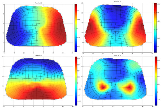 Herein, the voltage source is thought to be the voltage measurements recorded from the surface of the thorax. This potential source distribution is non-zero only on the surface of the model and zero anywhere else. Having the potential distribution throughout the thorax calculated, alongside the eigenvectors resulting from the eigenanalysis of the conductivity matrix , we can address our main objective. Thus, the weighting factors for each time instant can be extracted. The exploiting method in the current work uses a hybrid combination of Proper Orthogonal Decomposition (POD) and FEM on a torso model for rapid multiple solutions of the inverse problem that was proposed in our previous works [8,53]. The calculation of eigenvalues and eigenvectors for very high-rank matrices is a highly demanding task that requires a lot of computational resources as well as time. For this purpose, the whole eigenanalysis pre-processing was conducted overnight. After the eigenvalues and eigenvectors have been estimated and since the presence of any source does not alter the geometry or the electrical properties of the tissues, the potential generated can be easily represented with the expansion terms of (10). The last step is to calculate the weighting factors for every time step using (18).