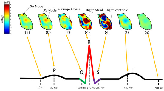 In order to interpret the results, it is necessary to represent all the heart components involved in cardiac activation. In Figure 8, the calculated potential distribution, as resulting from the direct inverse problem, is presented for several time instances. The calculated potential distribution over the epicardium tends to closely resemble the electric physiology of the heart, which is analyzed in detail in [54]. That is, starting at about 5 ms (with the signal origin being 1 ms), the area around the sinoatrial (SA) nodes, alongside some atrial nodes, is activated (10 ms), as in Figure 8a, when the P-waveform appears [54]. Some time instances later, i.e., in Figure 8b at t = 30 ms, the amplitude of the activation increases. The next nodes activated (Q-Waveform), around t = 130 ms, are the ones corresponding to the atrioventricular (AV) node, the Bundle of His, and the bundle branches (Figure 8c), following the anticipated cardiac activation. After this, the ventricular depolarization takes place, showing an R-waveform around 170 ms (Figure 8d), with the right ventricle activation slightly preceding it. After a while, i.e., around 200 ms, the S-waveform is displayed (Figure 8e), when the left ventricle depolarizes as well. At about 400 ms, the ventricular starts its repolarization (T-waveform), and all cells return to their resting potentials (Figure 8f).
