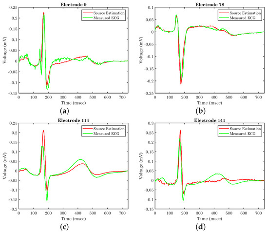 Having the epicardium potential distribution (reconstructed sources), it is now possible to determine whether the extracted equivalent source can generate the anticipated potential distribution over the thorax. These are compared against the original ECG measurements for validation purposes. Figure 9 illustrates the generated potential upon the corresponding electrodes after the evaluation of the classical forward problem, given the resulting epicardial potentials. For the self-validation of the method, the extracted results are given alongside the original ECG measurements for four different electrodes positioned in different regions of the torso. Figure 9 corresponds to electrodes 9, 78, 114, and 141, which are located on the back, on the chest, on the right, and on the left side of the thorax’s patient, respectively. We randomly chose four electrodes to display their generated potentials, with the only limitation of belonging in different areas of the torso surface in order to highlight the different accuracy of the estimated sources’ resulting voltages as compared against recorded ECG measurements. The locations of the presented electrodes over the thorax model can be found in Figure 1c. The calculated results tend to have better behavior when the torso’s back and the chest are concerned, whereas the results regarding the sides of the torso are sometimes unable to sufficiently follow the original signal. The problem mainly lies in the simplistic volume conductor model, as the geometry of the body plays a crucial role in the extraction of accurate results based on the measurements. The next step will be to improve the model, keeping in mind the maintenance of the low processing time for real-time applications. For example, the voltage in electrode 114 (Figure 9c) fails to keep up with the high R waveform, and the voltage in electrode 141 (Figure 9d) presents the T waveform with a time delay with lower amplitude.